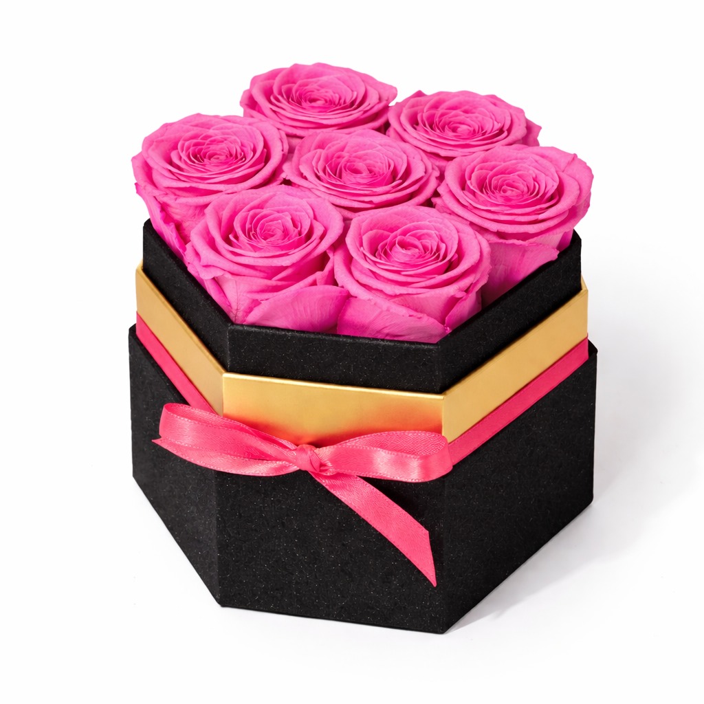 Preserved Pink Rose Luxury Box. This premium gift features 7 real preserved roses arranged beautifully inside a stylish hexagon-shaped black box with a luxurious golden band and satin ribbon.